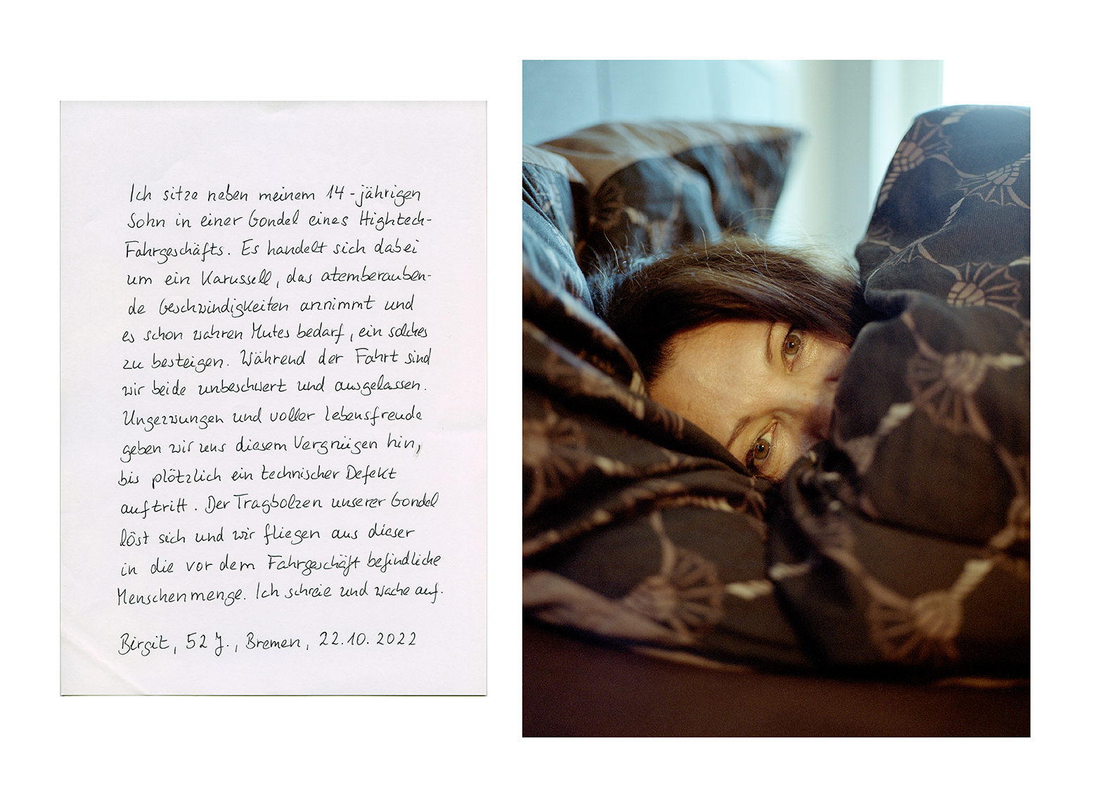 I photograph people in their sleeping places. And the people share a dream with me. This results in photos and stories that belong together.